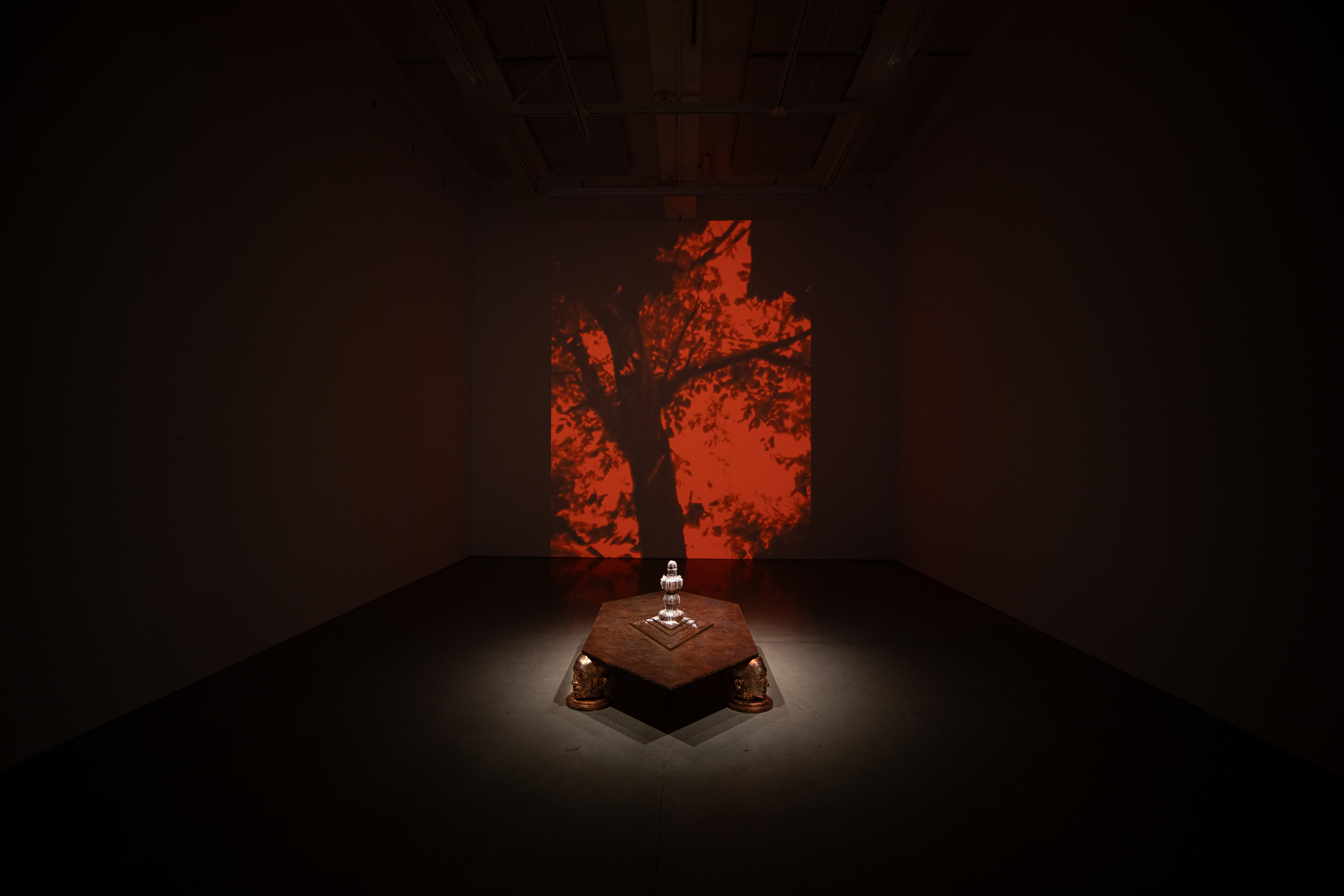Copper leaf, wax, camphor essential oil, plaster, MDF and video