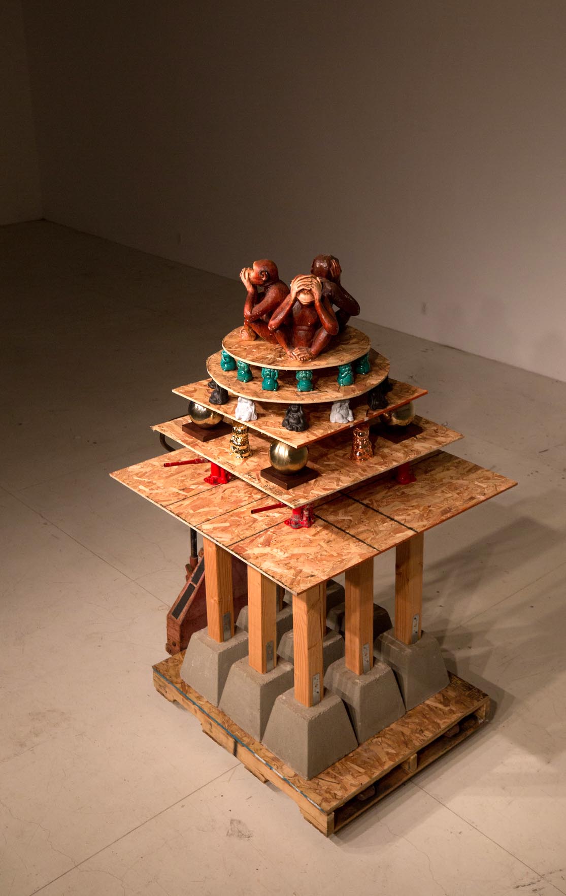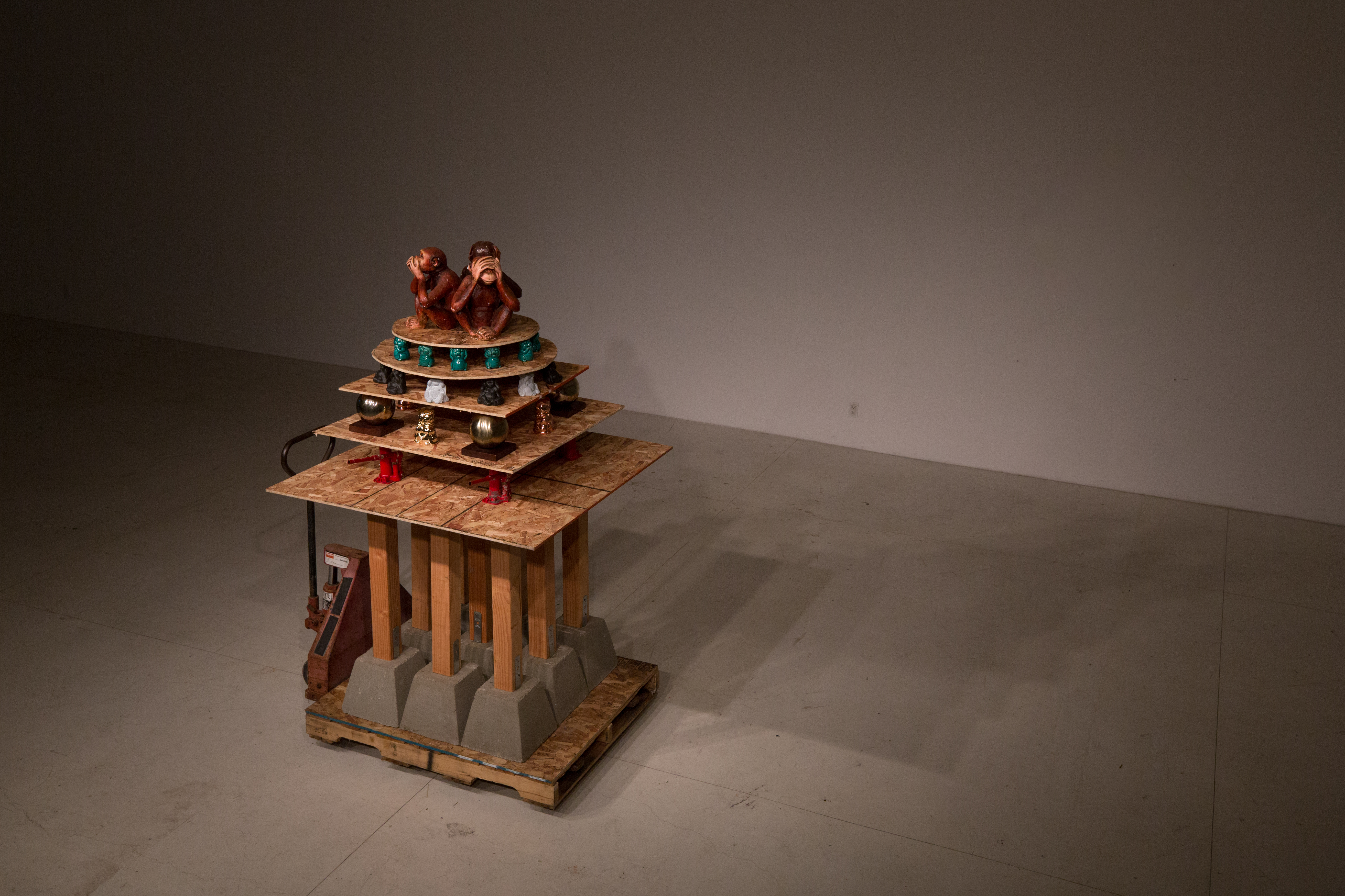Concrete blocks, plywood, pallet and bottle jacks and found objects.