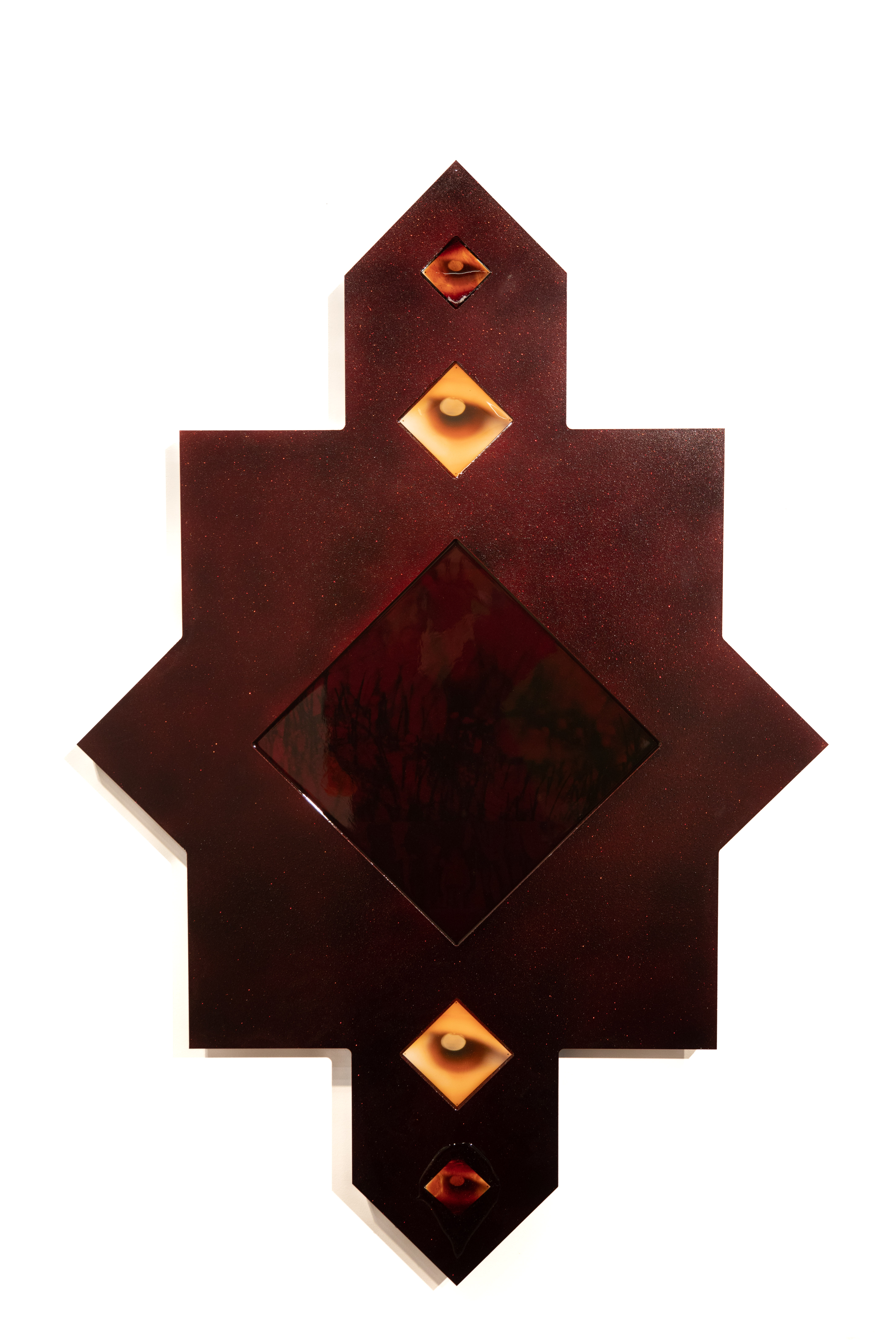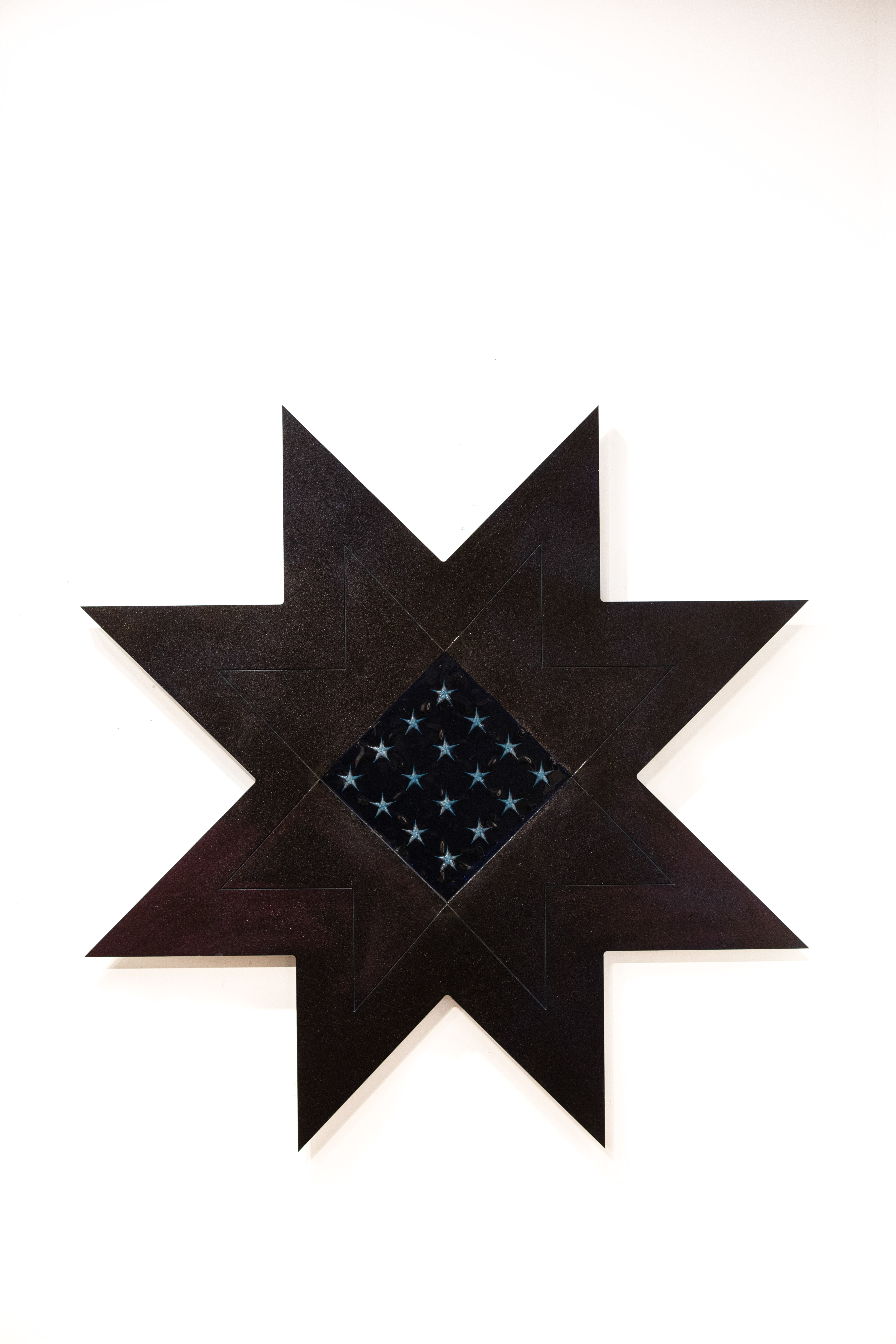 Nylon flag, resin, automotive paint, gold emergency blanket, tar and oil paint on Wood