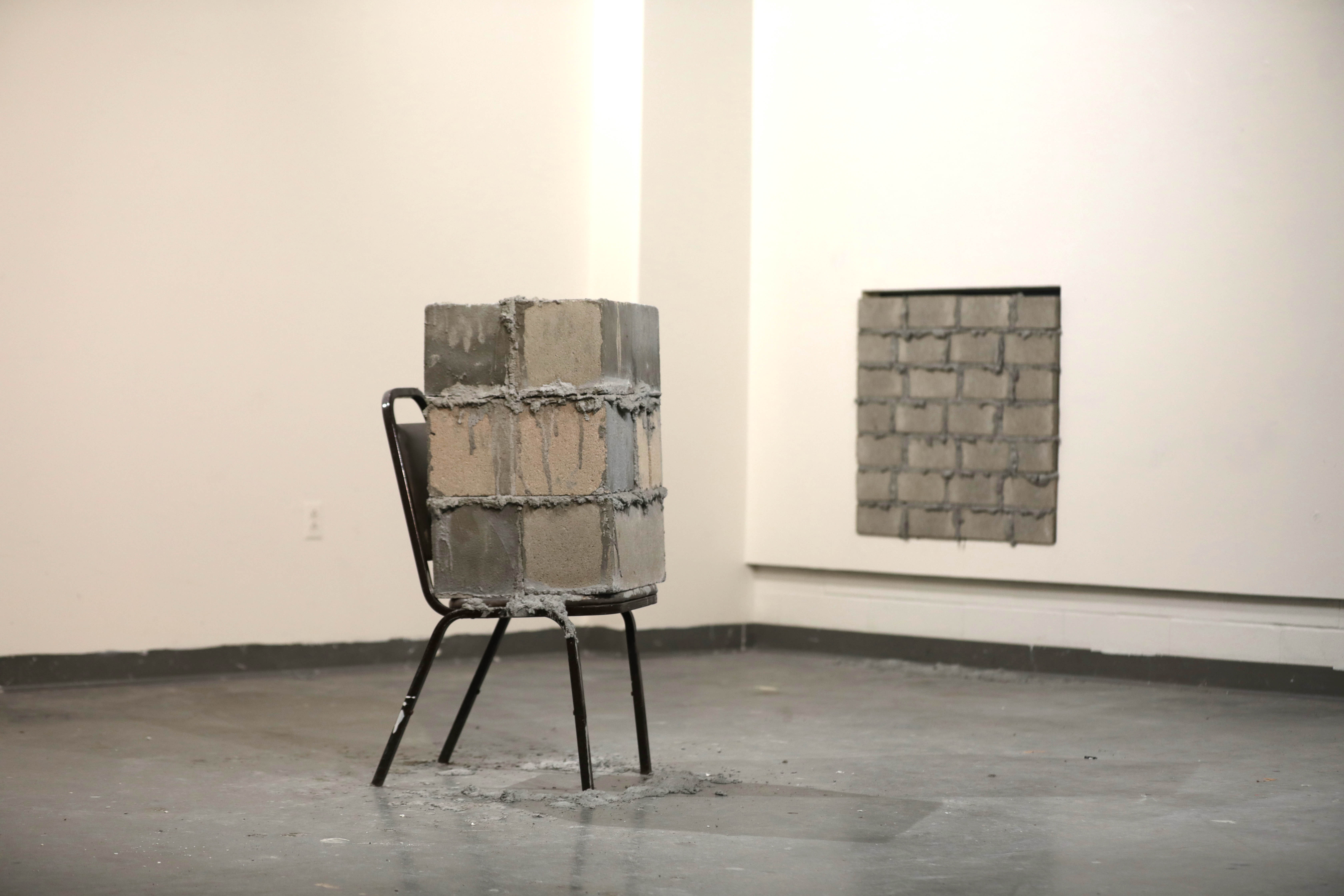 School chair, cement and concrete bricks